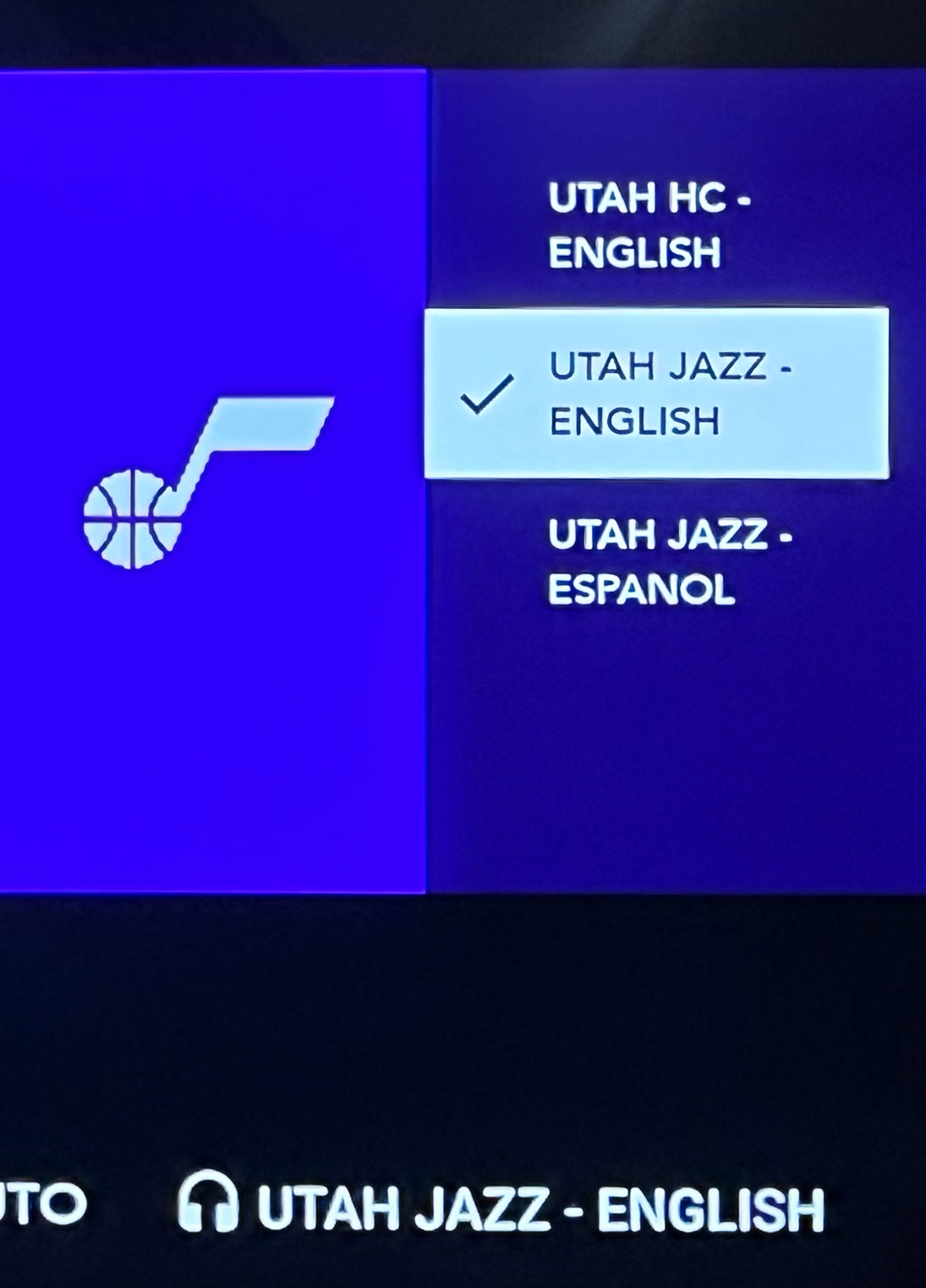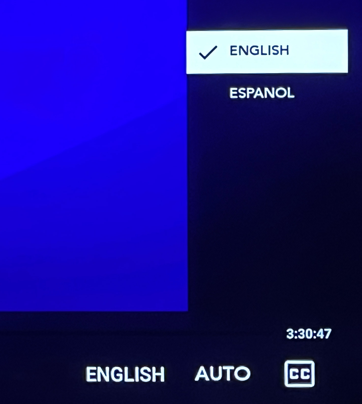 To select your audio language, navigate with your device’s remote to the English tab at the bottom right of the screen and push select.